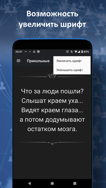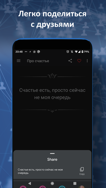 De app biedt niet alleen de mogelijkheid om statussen aan favorieten toe te voegen, maar ook om ze eenvoudig te delen via verschillende platforms zoals SMS, VKontakte en WhatsApp. Gebruikers kunnen ook de lettergrootte aanpassen voor een betere leeservaring. Deze applicatie is een geweldige aanvulling voor iedereen die zijn of haar stemming of gedachten wil delen met unieke en aansprekende statusupdates.