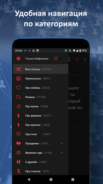 Интересные и красивые Статусы is een Android-applicatie die meer danstatusupdates biedt, perfect voor sociale media, sms en chat. De app is ingedeeld in verschillende categorieën zoals liefde, leven, humor, en vriendschap, waardoor gebruikers eenvoudig de juiste status kunnen vinden voor elke situatie. Met een gebruiksvriendelijke interface kunnen gebruikers snel door de diverse secties navigeren en hun favoriete statusupdates opslaan.